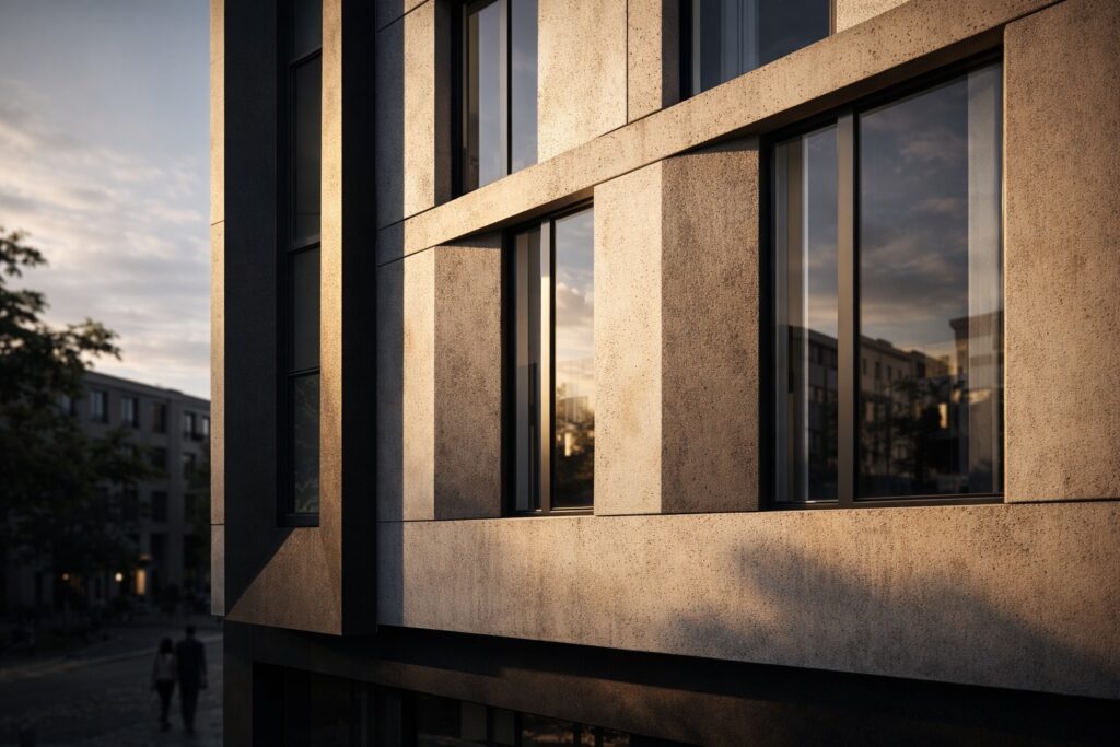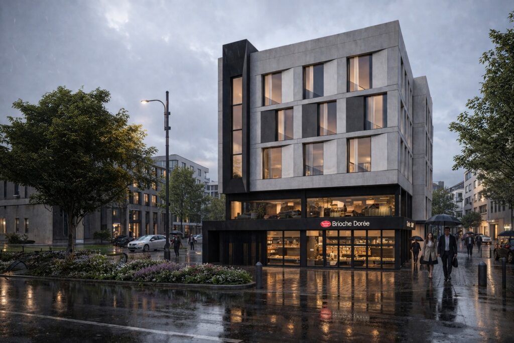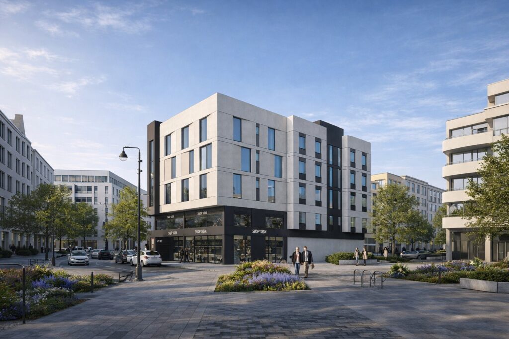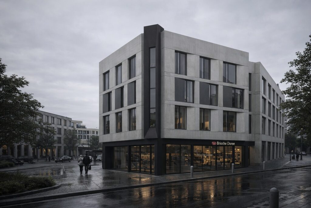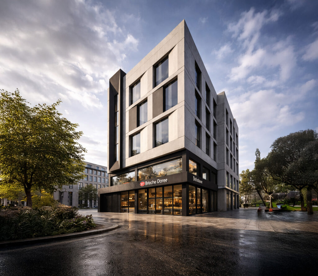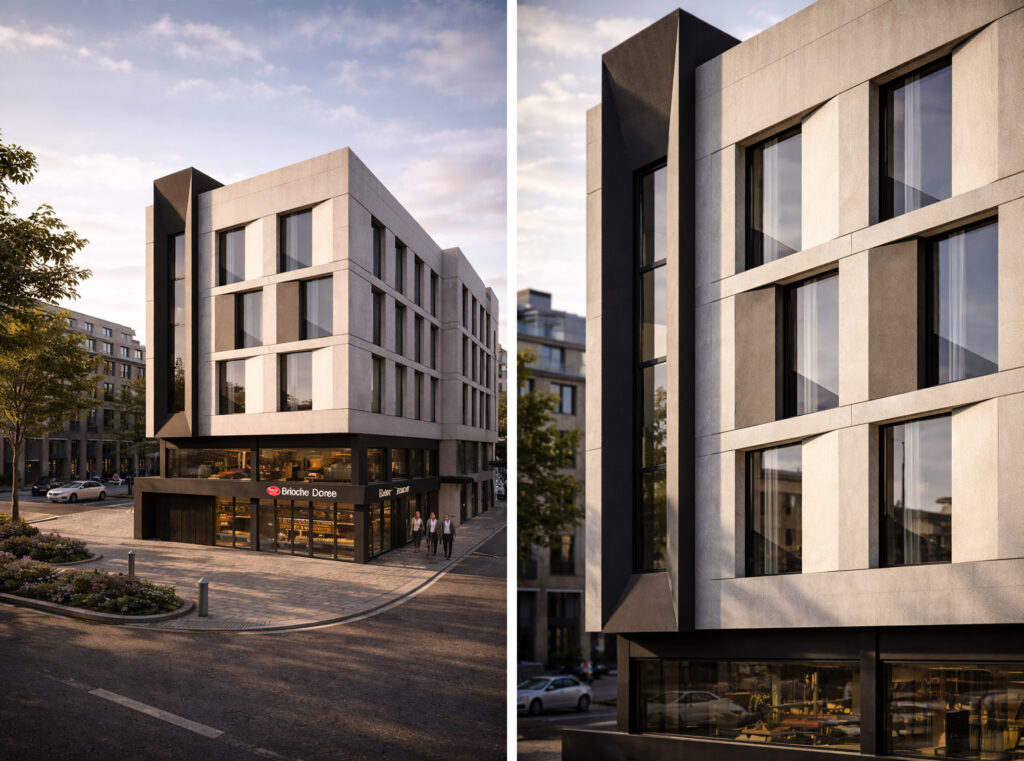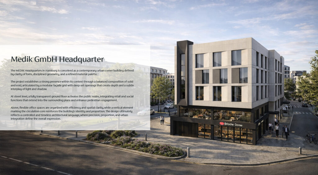The MEDIK Headquarters is conceived as a contemporary urban building that anchors its corner site through clarity of form, controlled proportions, and a disciplined architectural language.